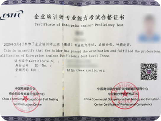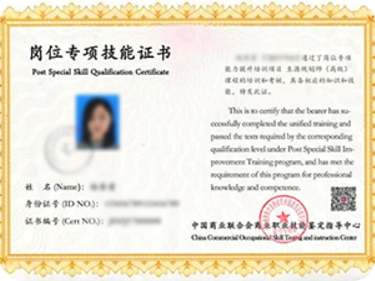 证书由中国商业联合会商业职业技能鉴定中心颁发 中国商业联合会是人力资源和社会保障部批准设立的,负责商业服 务行业职业技能鉴定及相关工作组织实施的事业法人单位。根据本 单位职位,在人力资源和社会保障部指导和授权下,开展商业服务 业行业相关证书考评,颁发对应的技能和专业证书;负责组织实施 全国商业服务业技能考评员的考评、认证及管理工作。经培训考核 合格的学员,可以获得本中心颁发的《岗位专项技能证书》。
